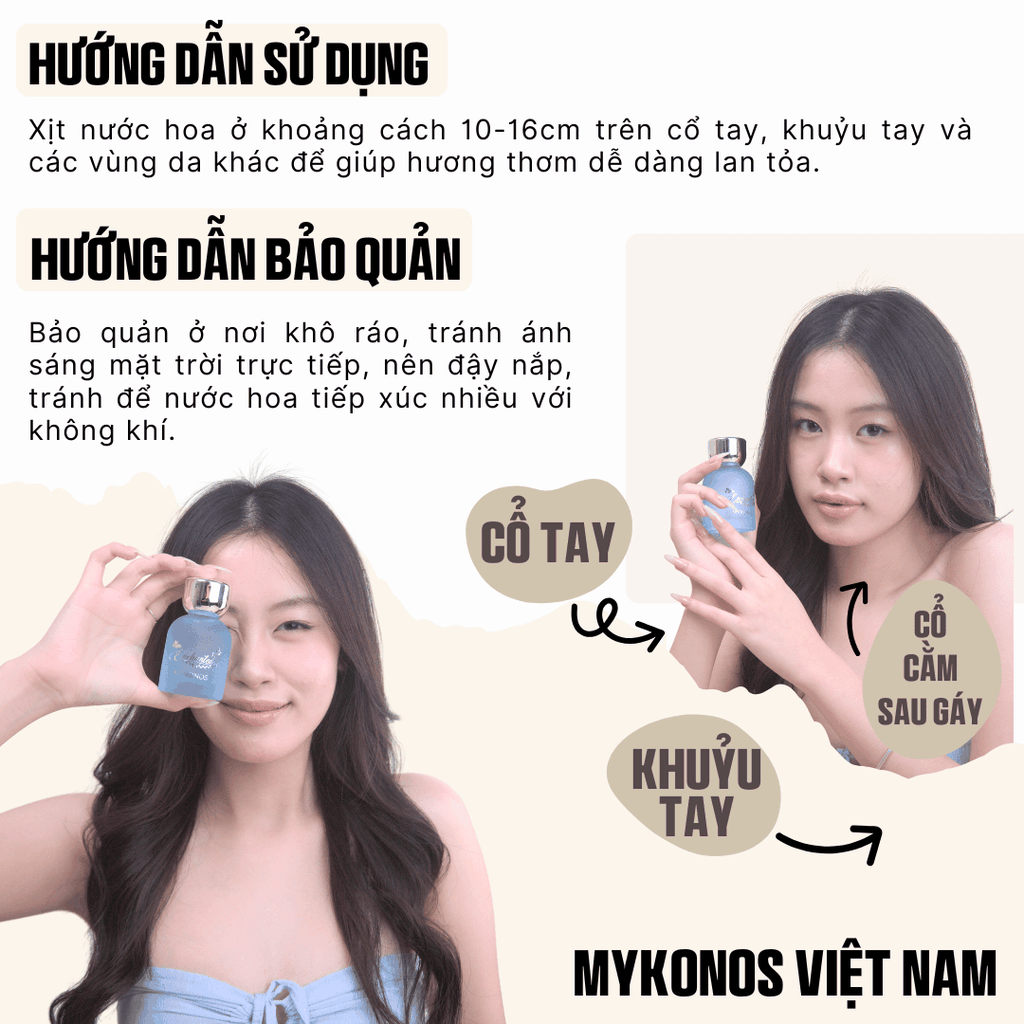 Hướng dẫn sử dụng: Xịt nước hoa ở khoảng cách 10-16cm trên cổ tay, khuỷu tay và các vùng da khác để giúp hương thơm dễ dàng lan tỏa.